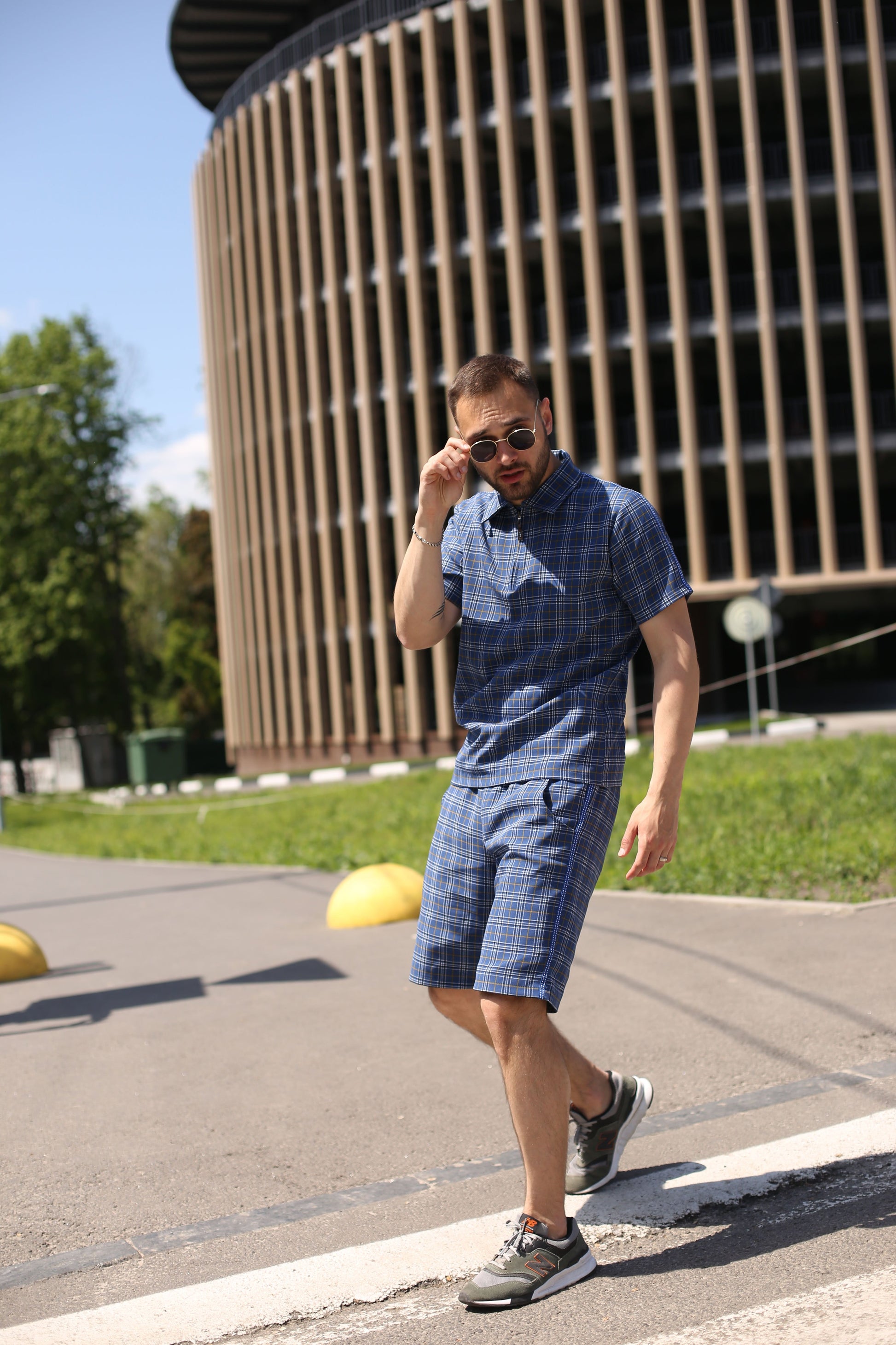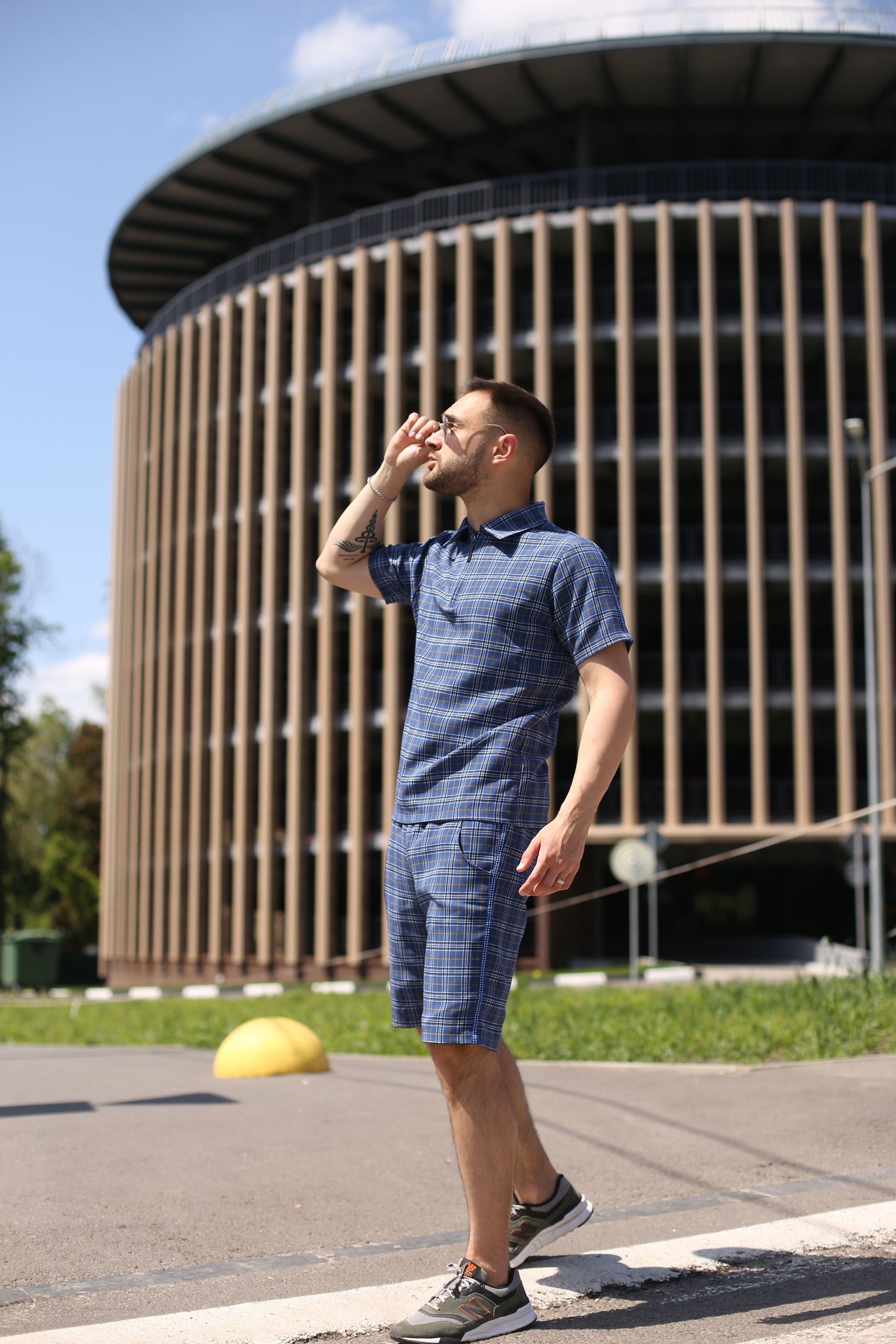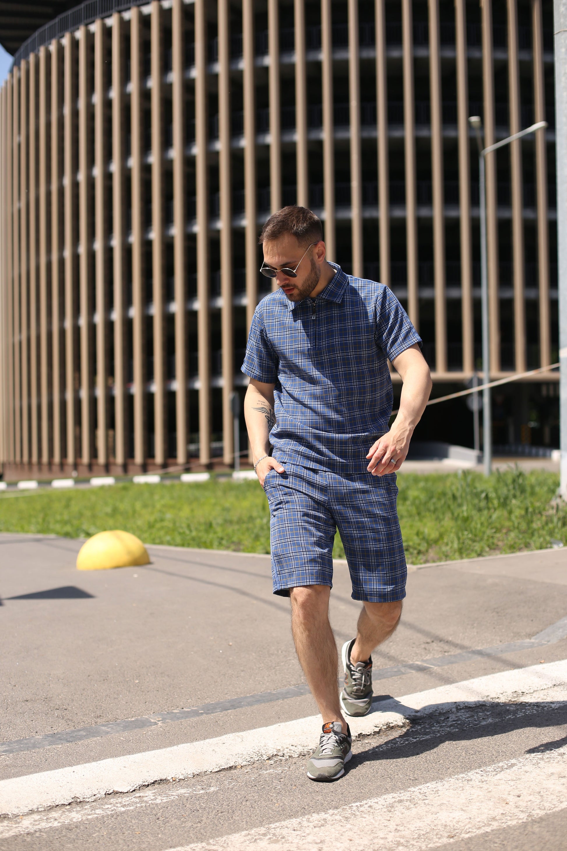 Light summer polo shirt and extra long shorts set from suiting fabric. Suitable for warm seasons due to its high quality and breathable fabric. The suit is suitable for daily wear, almost doesn't wrinkle and easy-moving.